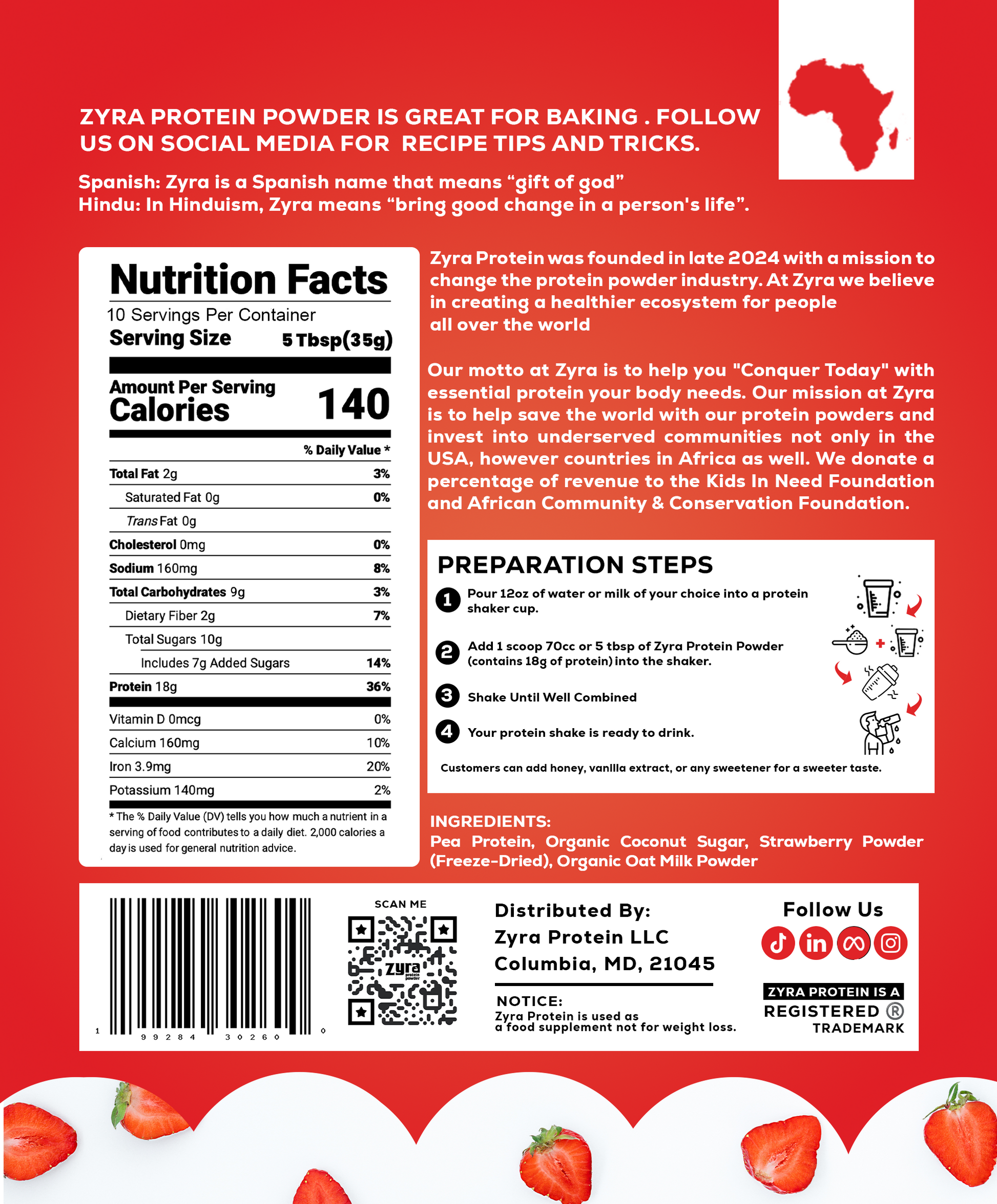 Zyra Protein Powder is packed with 18g of protein per serving, which is everything you need to start your day off right. Our strawberry powder uses freeze-dried strawberry powder, the best method for drying fruit and maintaining the key nutrients.