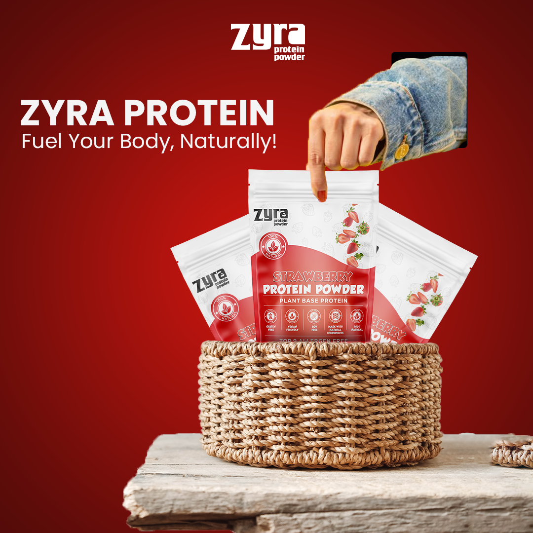 Zyra Strawberry Protein Powder is a clean, plant-based blend that delivers 18g of protein per scoop, with only four natural ingredients—no fillers or artificial additives.